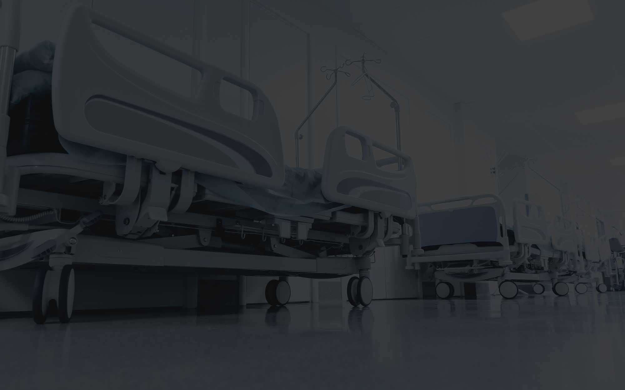 View of various hospital beds lining a hallway