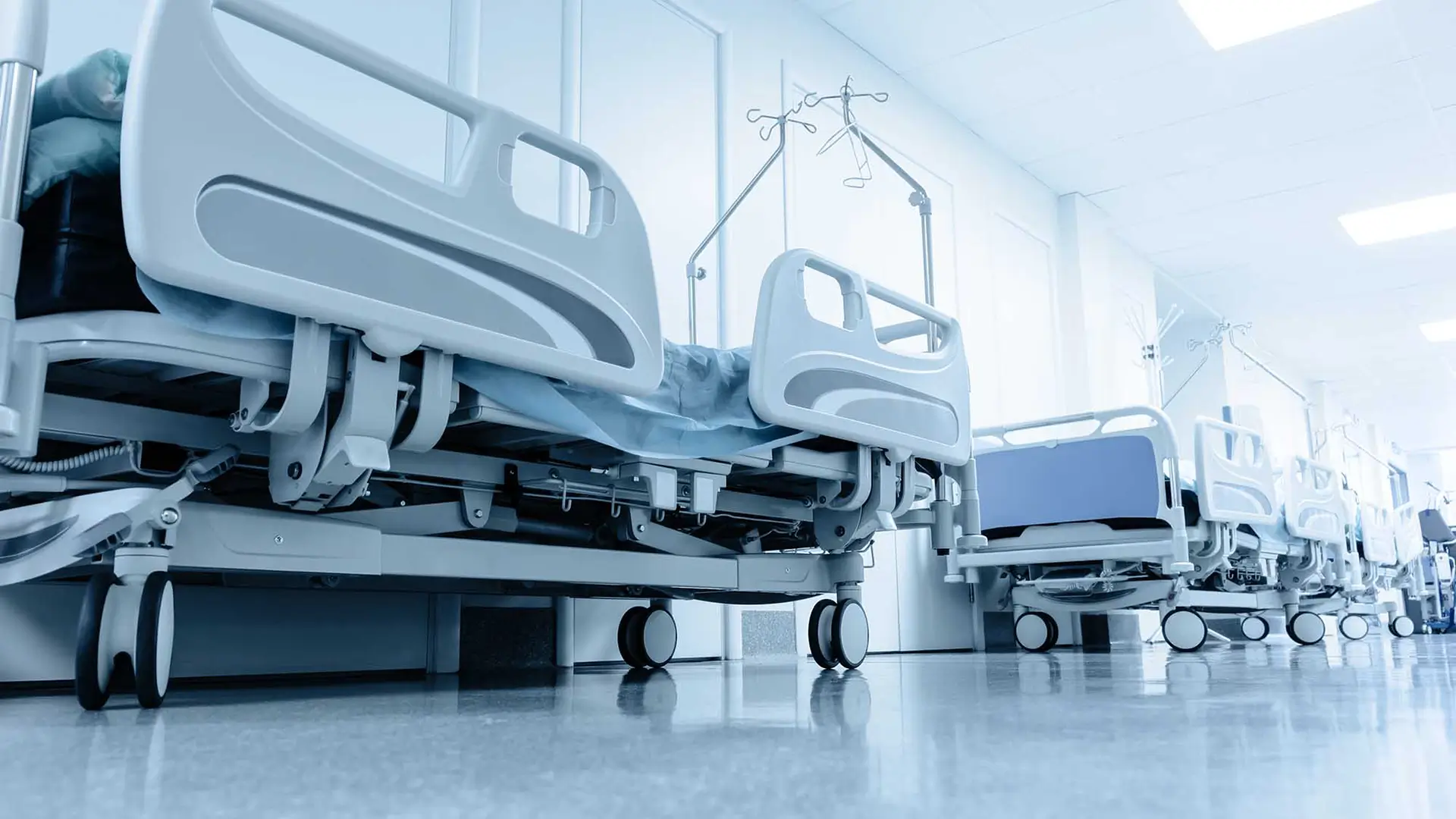 View of various hospital beds lining a hallway