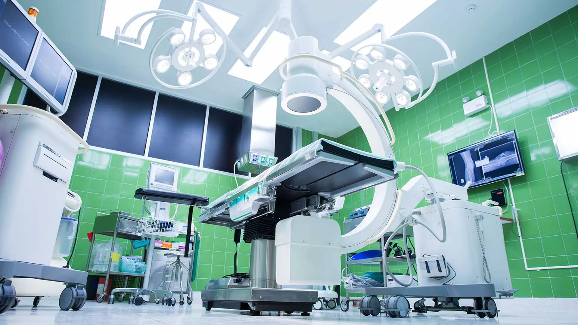 Inside view of a green-walled operating room