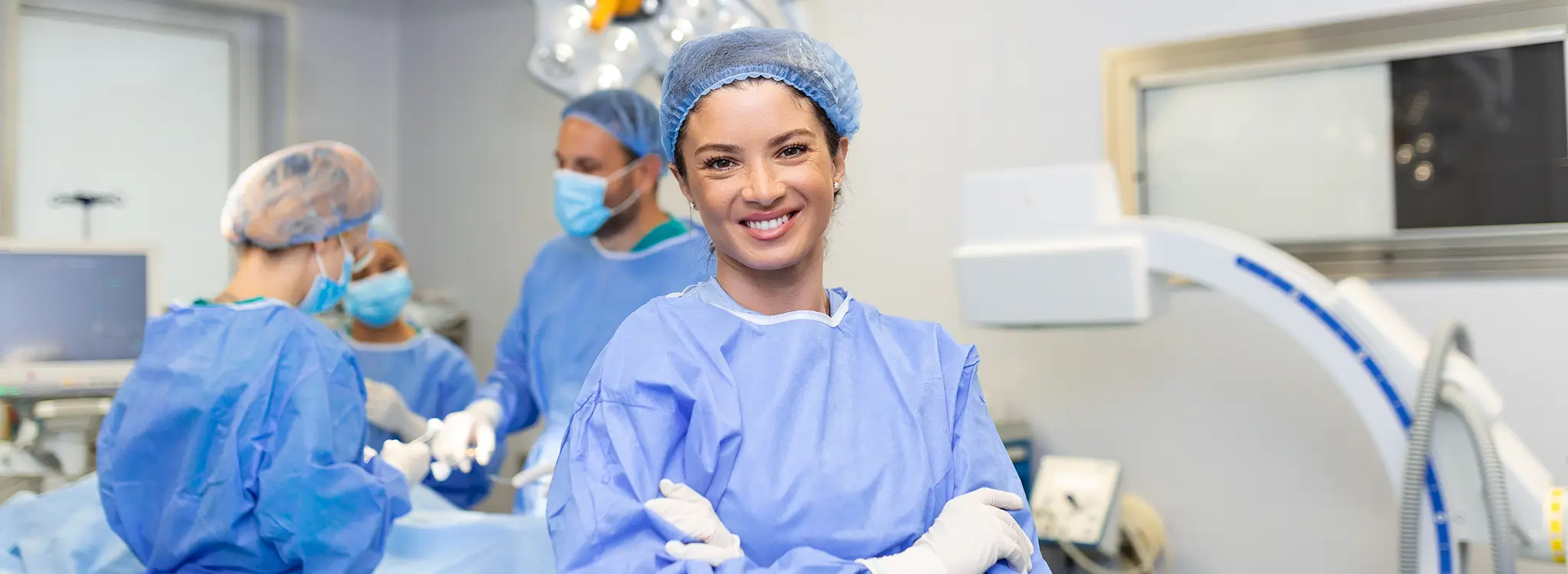 A woman in scrubs stands in an operating room, ready for a surgical procedure.